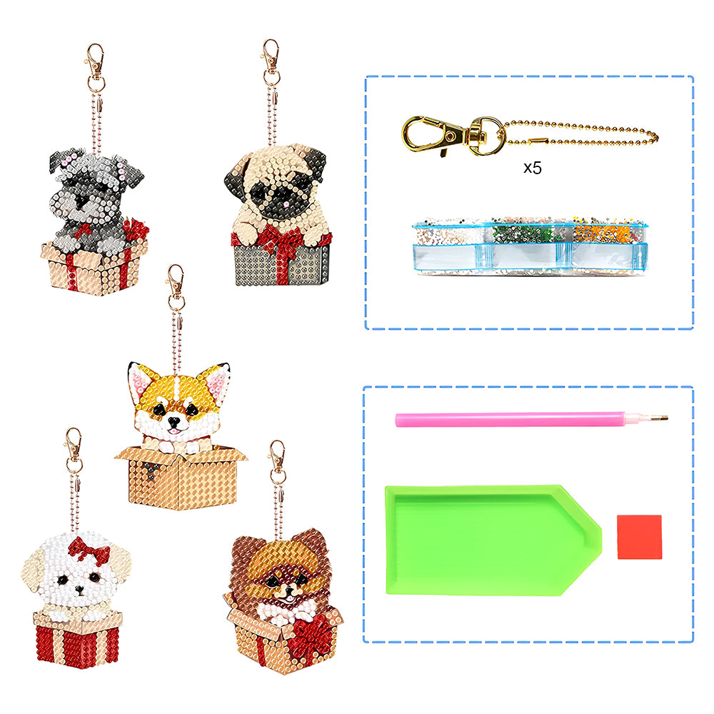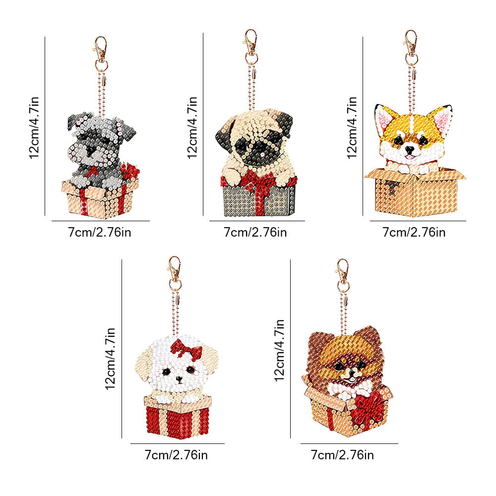 5Pcs Hund in Geschenkbox Acryl Doppelseitiger Schlüsselanhänger Diamond Painting