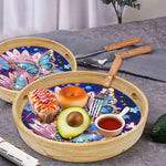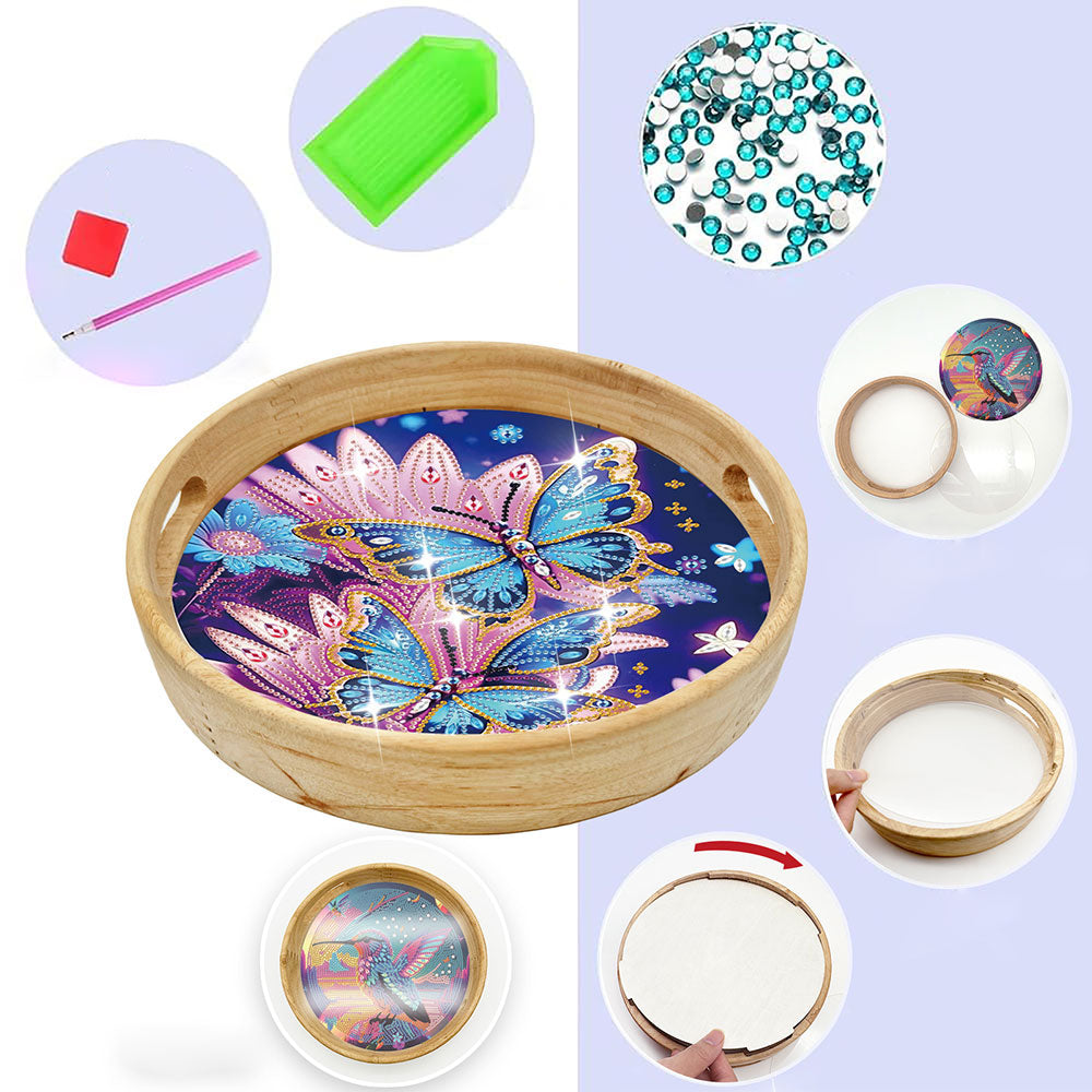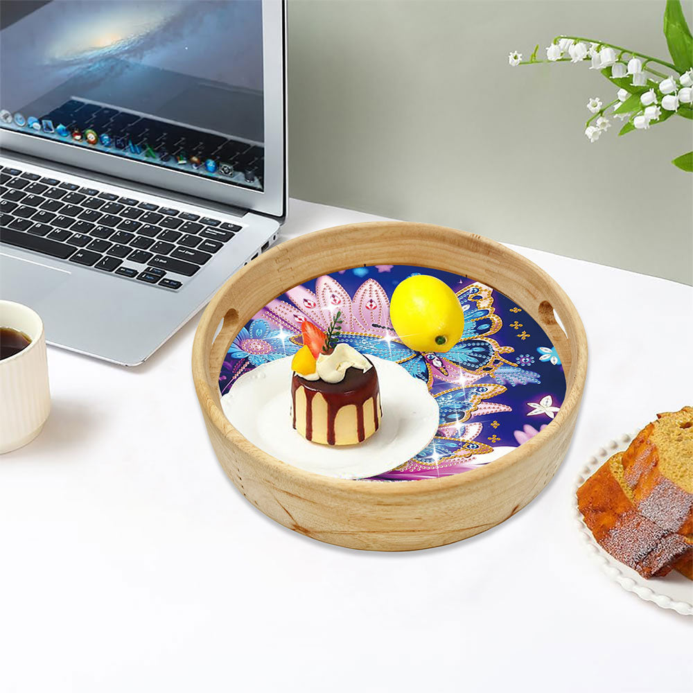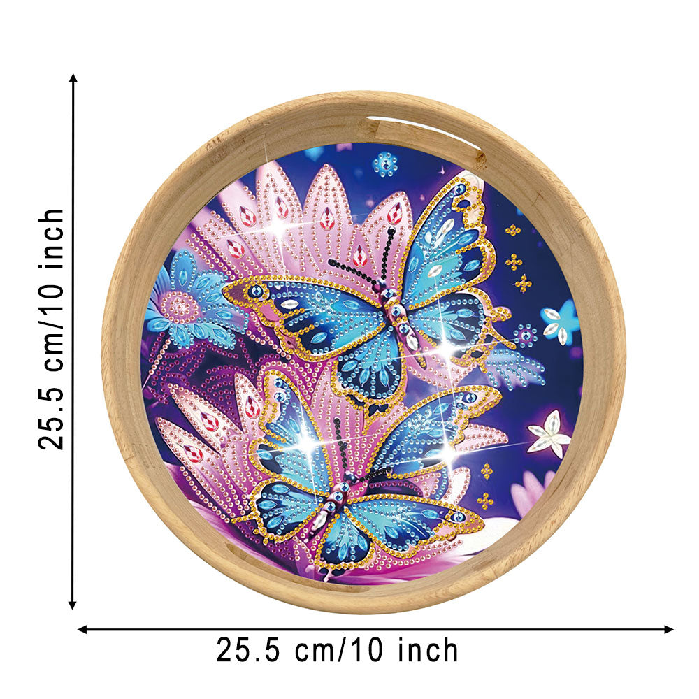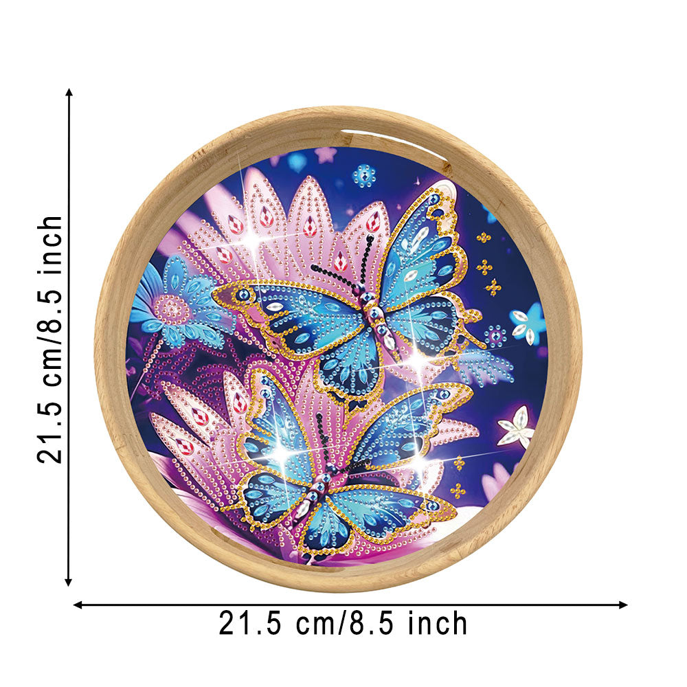 Blauer Schmetterling und Rosa Blumen Rundes Holz Serviertablett Diamond Painting