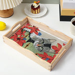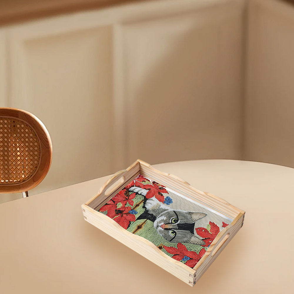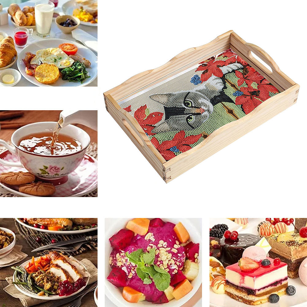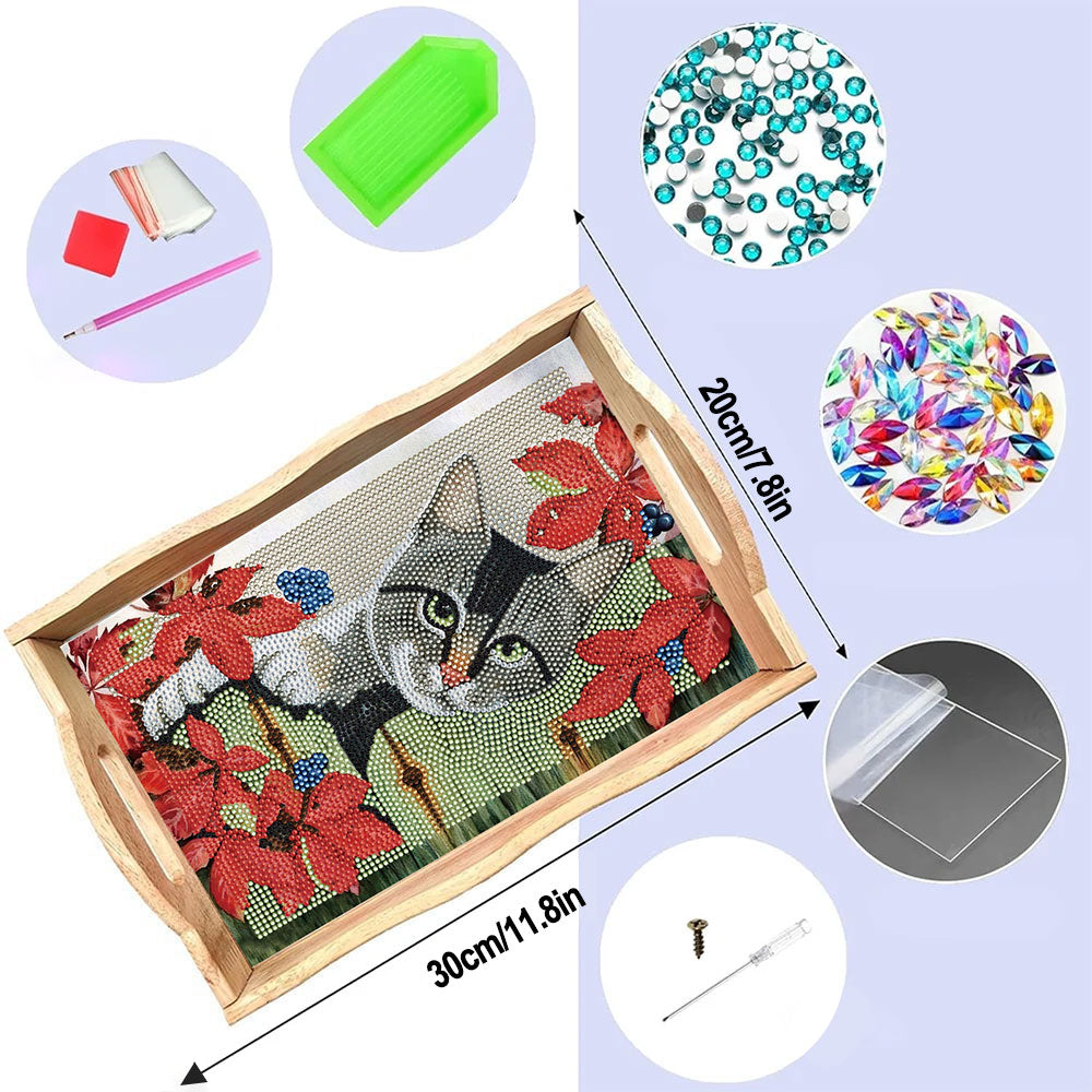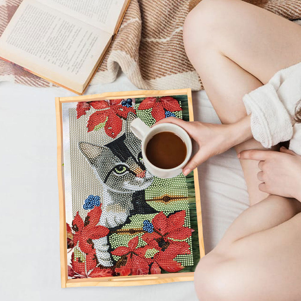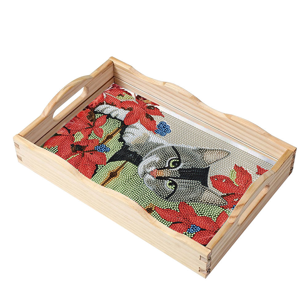 Graue Katze und rote Blumen Holz Serviertablett Diamond Painting